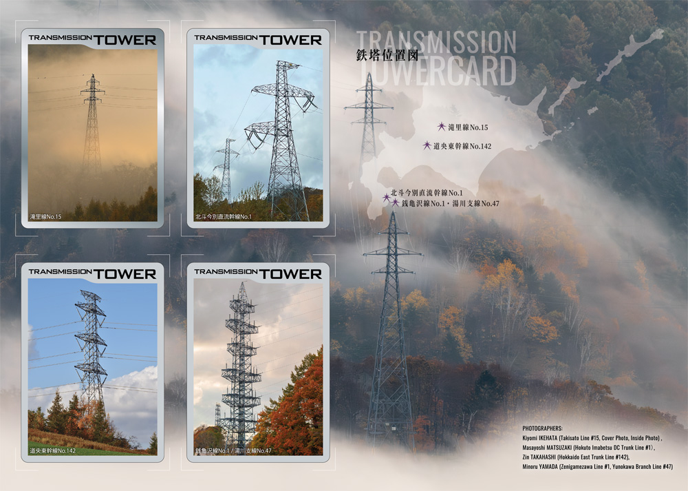 昼夜の寒暖差が生む雲海・澄んだ空気・紅葉・冬の訪れといった季節の移ろいをとらえた4基の鉄塔をカードにしました。これらを、かつては炭鉱でにぎわった芦別の「雲海」と鉄塔の情景を写したカードケースに収めています。カード表面には鉄塔の写真、裏面には設備情報と紹介文を掲載しています。